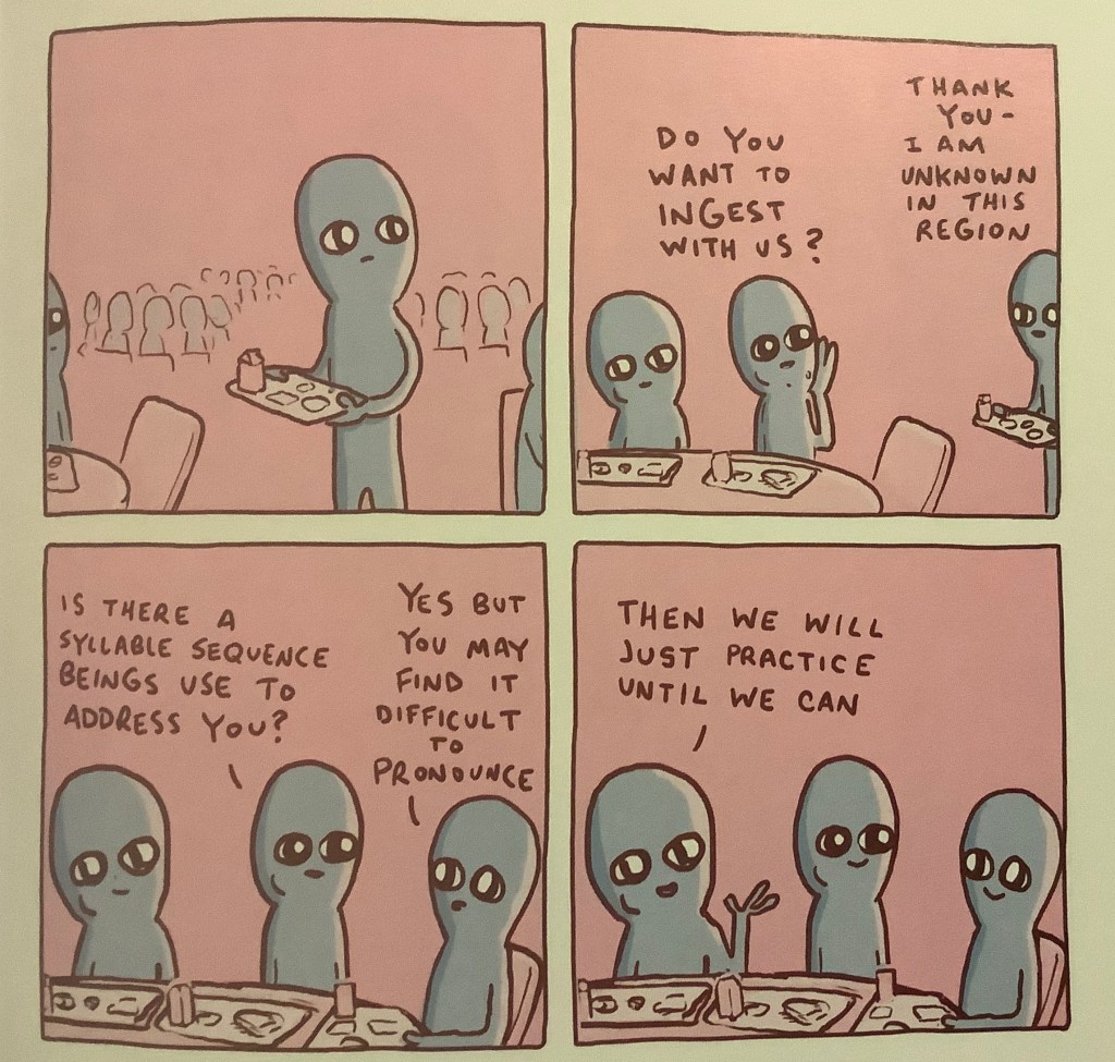 What is interesting about Pyle’s Strange Planet, is how alienating simple synonymic substitutions applied to your everyday language can be. Here, the alienated being does not “eat” with the others, it (they?) “ingests” with them. It doesn’t have a “name” but a “syllable sequence” (which amuses me). Pyle’s work is all about this uncanniness, this going back to humanity via an altered discourse: if you subtly change how you speak about things it creates this gap which alienates you from the comfort of the everyday, though it is only the everyday that Pyle draws. The Freudian sense of the uncanny is this feeling of disturbance at what returns which was once familiar. A déjà vu, but this phrase is despeakable.